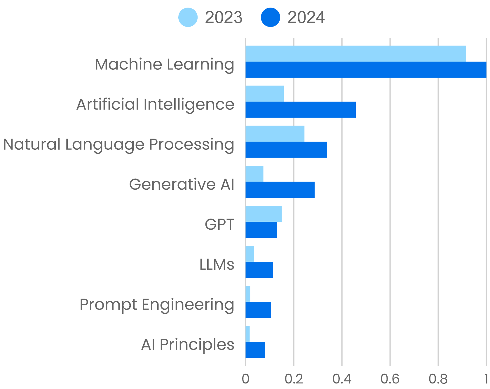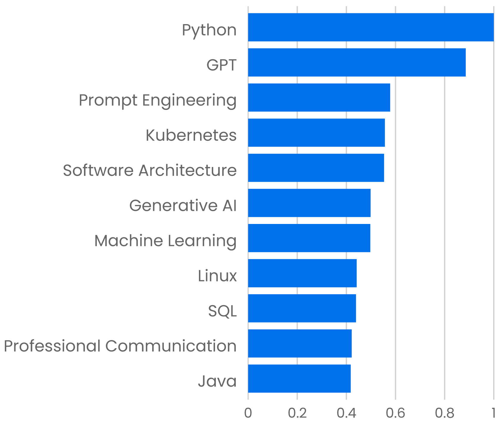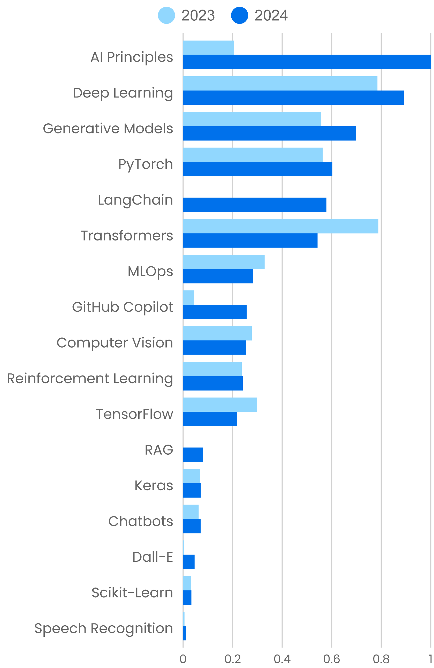 Finally, some notes about methodology. Skip this paragraph if you want; we don’t mind. This report is based on the use of O’Reilly’s online learning platform from January 1, 2024, to September 30, 2024. Year-over-year comparisons are based on the same period in 2023. The data in each graph is based on O’Reilly’s “units viewed” metric, which measures the actual use of each item on the platform. It accounts for different usage behavior for different media: text, courses, and quizzes. In each graph, the data is scaled so that the item with the greatest units viewed is 1. That means items within a graph are comparable to each other, but you can’t compare an item in one graph to an item in another. And all percentages are reported with two significant digits.