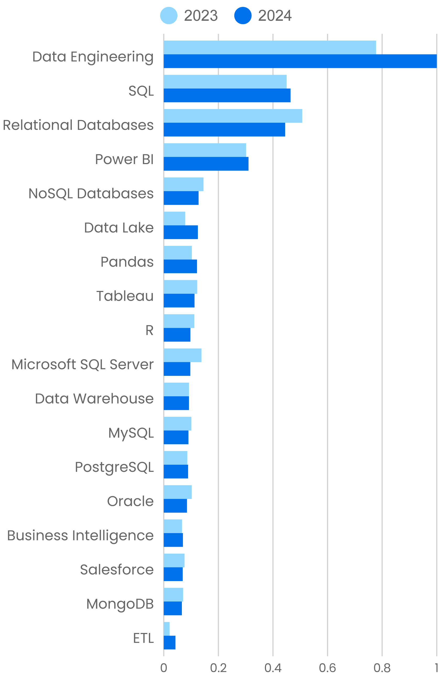 Therefore, it’s not surprising that Data Engineering skills showed a solid 29% increase from 2023 to 2024. SQL, the common language of all database work, is up 3.2%; Power BI was up 3.0%, along with the more general (and much smaller) topic Business Intelligence (up 5.0%). PostgreSQL is close to edging ahead of MySQL, with a 3.6% gain. Interest in Data Lake architectures rose 59%, while the much older Data Warehouse held steady, with a 0.3% decline. (In our skill taxonomy, Data Lake includes Data Lakehouse, a data storage architecture that combines features of data lakes and data warehouses.) Finally, ETL grew 102%. With the exception of ETL, the gains are smaller than the increases we saw for AI skills, but that makes sense: AI is an exciting new area, and data is a mature, stable category. The number of people who need specialized skills like ETL is relatively small but obviously growing as data storage becomes even more important with AI.