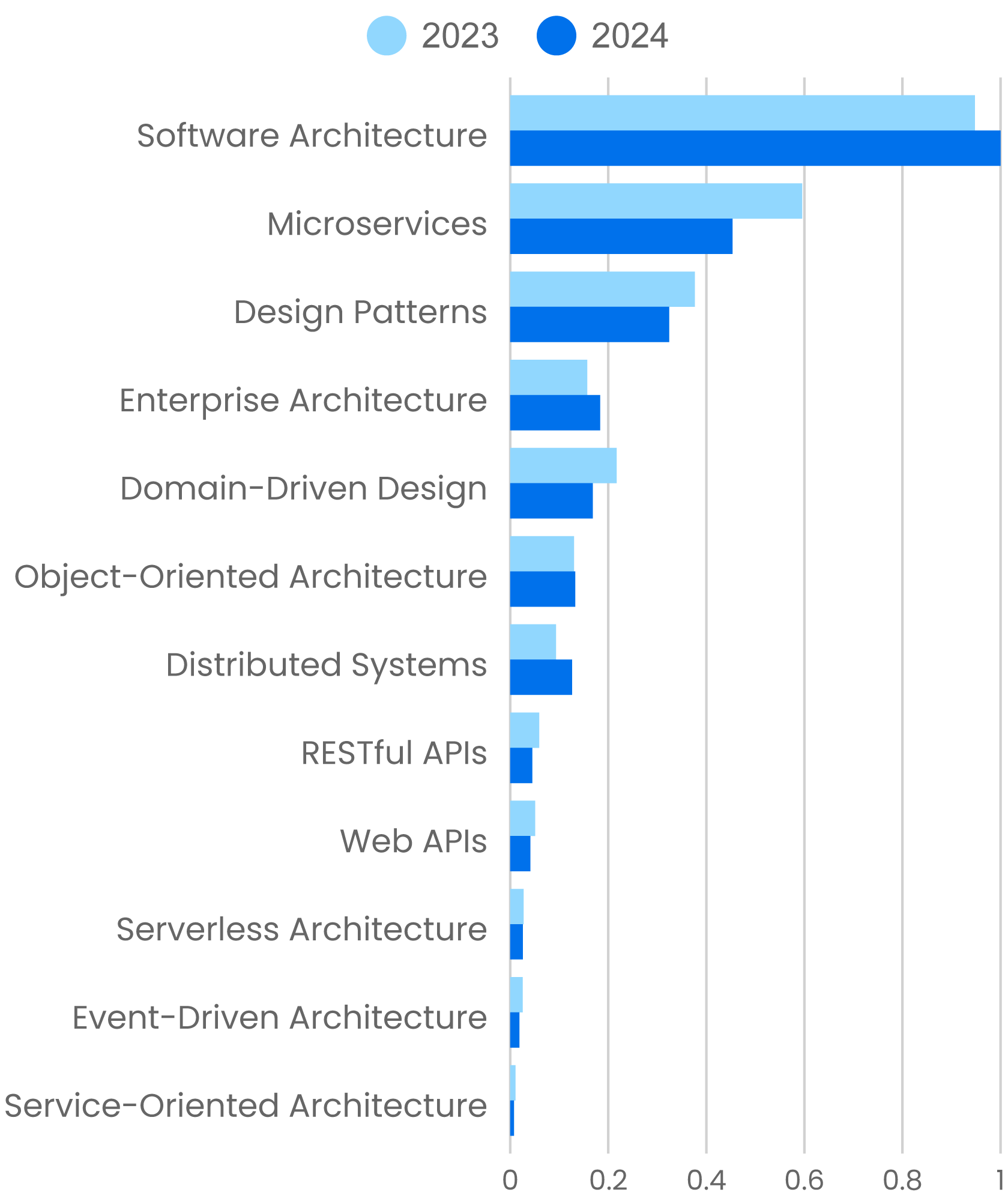 This year’s data shows that software architecture continues to be one of the most desirable skills in the industries we serve. Usage of material about Software Architecture rose 5.5% from 2023 to 2024, a small but significant increase. But it’s more important to ask why it increased. A position in software architecture may be perceived as more secure in a time of layoffs, and it’s often perceived as another step forward in a career that moves from junior programmer to senior to lead. In addition, the rise of AI presents many architectural challenges: Do we try to build our own model? (The answer is usually “no.”) Should we use an AI service provider like OpenAI, Anthropic, Microsoft, or Google, or should we fine-tune and host our own model on our own infrastructure? How do we build applications that are safe (and how do we define “safe”)? How do we evaluate performance? These questions all have a bearing on software architecture. Furthermore, AI might provide tools to help software architects, but so far, these tools can do little for the substance of the job: understanding customers’ needs and helping them define what they want to build. With AI in the picture, we’re all building new kinds of applications—and those applications require architects to help design them.