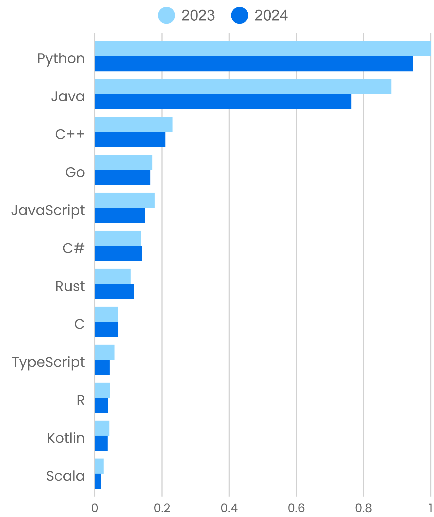 Could generative AI have had an effect on the development of programming language skills? It’s possible; shortly after GPT-3 was released, Simon Willison reported that he was learning Rust with the help of ChatGPT and Copilot, and more recently that he’s used Claude to write Rust code that he has in production, even though he doesn’t consider himself a skilled Rust developer.