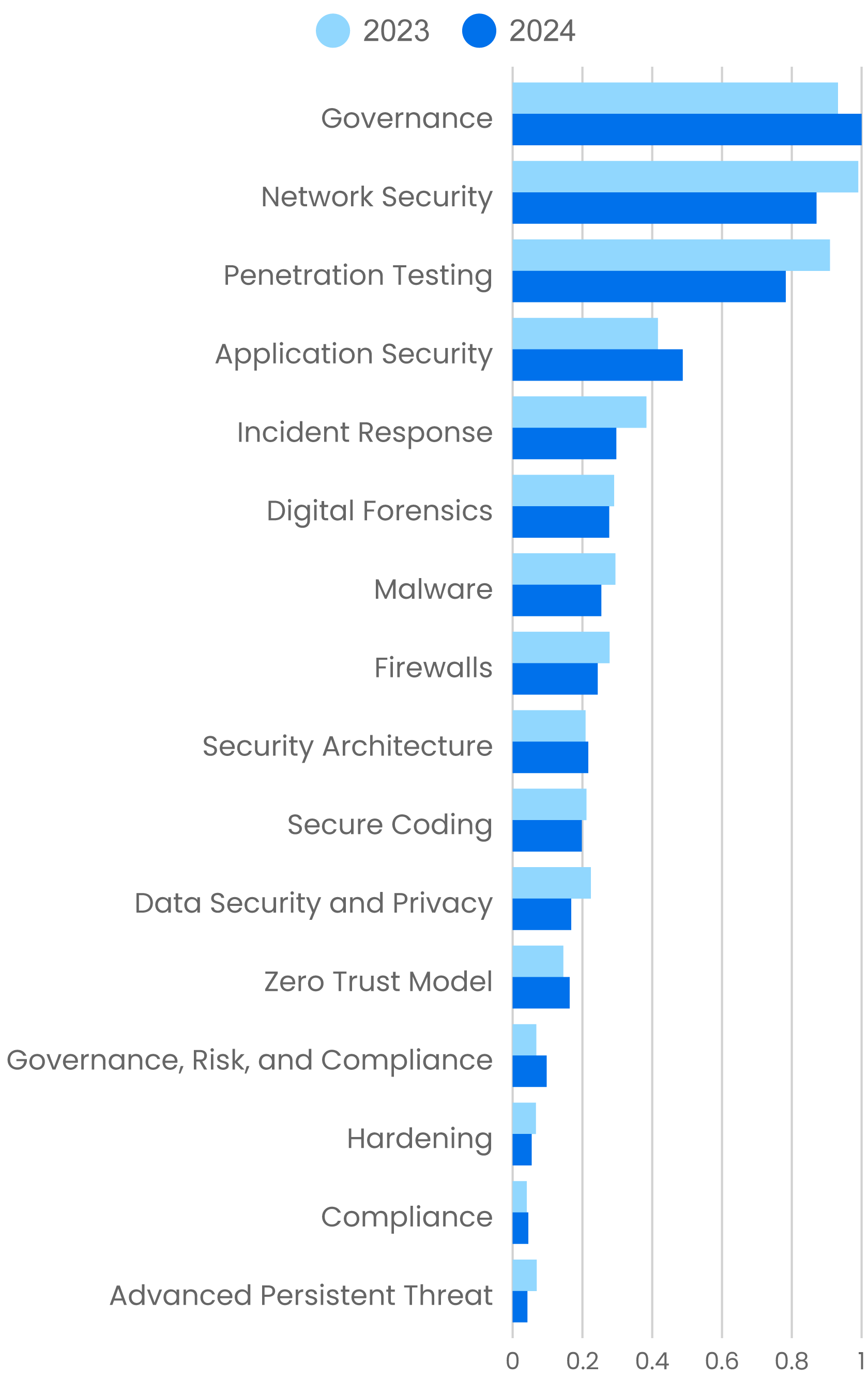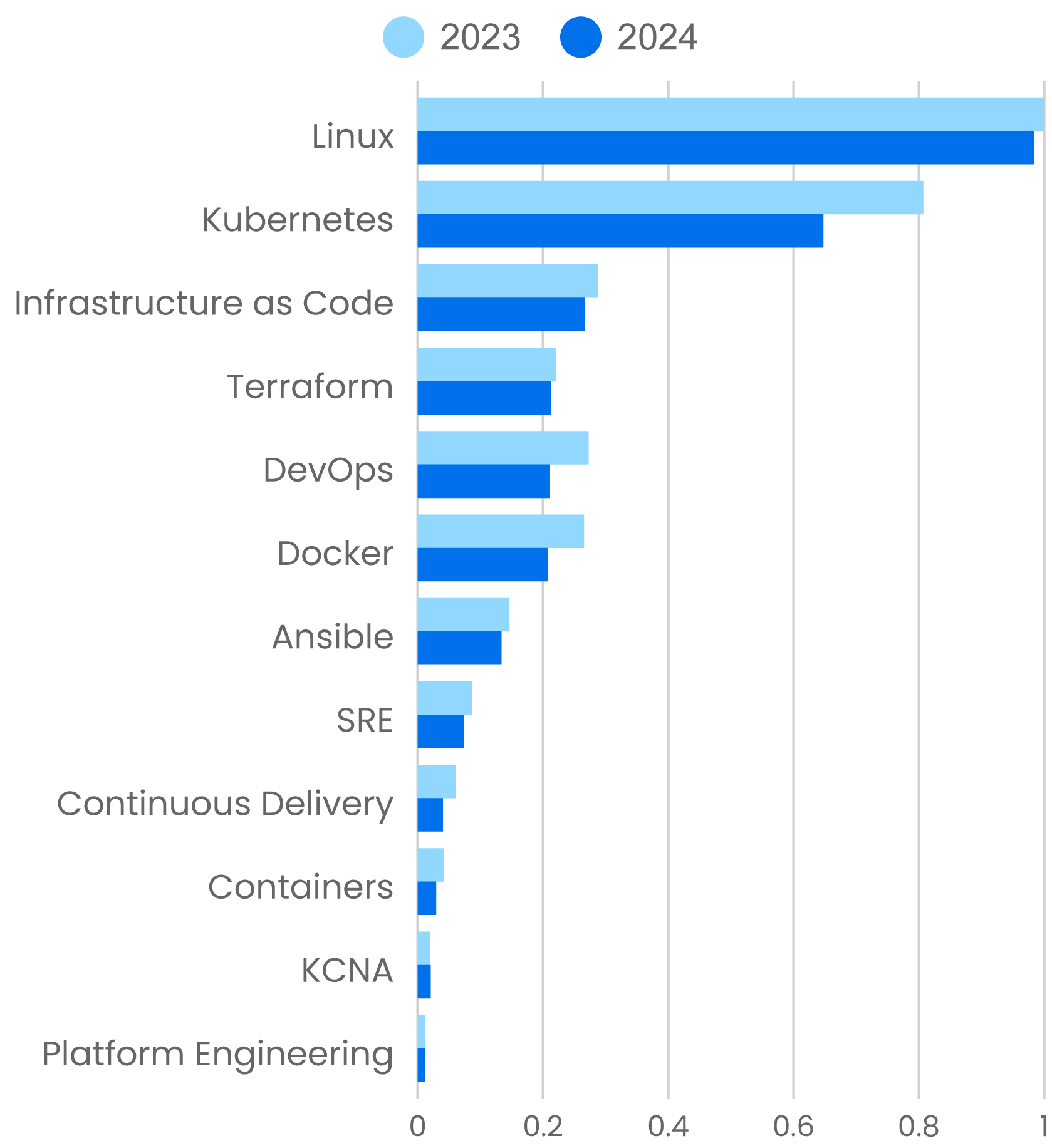 We’re puzzled by the drop in use of content about Network Security, which corresponds roughly to the drop in Cisco certifications. Network Security is still the second most widely used skill, but it’s down 12% from 2023 to 2024. Perhaps network security isn’t deemed as important when employees wander in and out of company networks and applications are distributed between in-house servers and the cloud. We hope that our users aren’t making that mistake. A bigger issue is that networks haven’t changed much in the past few years: We’re still using IPv4; we’re still using routers, switches, and firewalls, none of which have changed significantly in recent years. What has changed is the way security is implemented. Cloud computing and zero trust have moved the focus from big-iron networking devices to interactions between systems, regardless of how they are connected.
