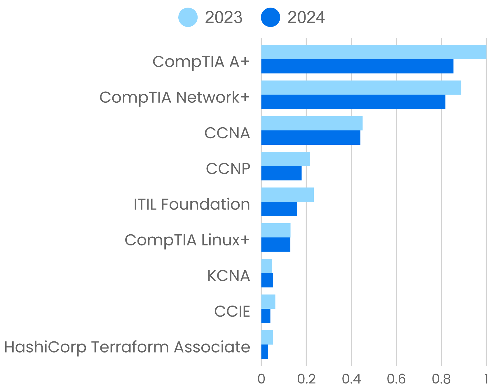 For many years, Cisco’s certifications have been the gold standard for IT. Cisco Certified Network Associate (CCNA), a fairly general entry-level IT certification, showed the greatest usage and the smallest decline (2.2%). Usage of content to prepare for the Cisco Certified Network Practitioner (CCNP) exams, a cluster of related certifications on topics like enterprise networking, data centers, and security, dropped 17%. The Cisco Certified Internet Engineer (CCIE) exams showed the greatest decline (36%). CCIE has long been recognized as the most comprehensive and in-depth IT certification. We’re not surprised that the total usage of this content is relatively small. CCIE represents the climax of a career, not the start. The number of people who attain it is relatively small, and those who do often include their CCIE number with their credentials. But the drop is surprising. It’s certainly true that IT is less focused on heavy-duty routing and switching for on-prem data centers (or even smaller machine rooms) than it was a few years ago. That work has largely been offloaded to cloud providers. While routers and switches haven’t disappeared, IT doesn’t need to support as wide a range of resources: They need to support office WiFi, some databases that need to remain on-premises, and maybe a few servers for office-related tasks. They’re very concerned about security, and as we’ll see shortly, security certifications are thriving. Is it possible that Cisco and its certifications aren’t as relevant as they used to be?