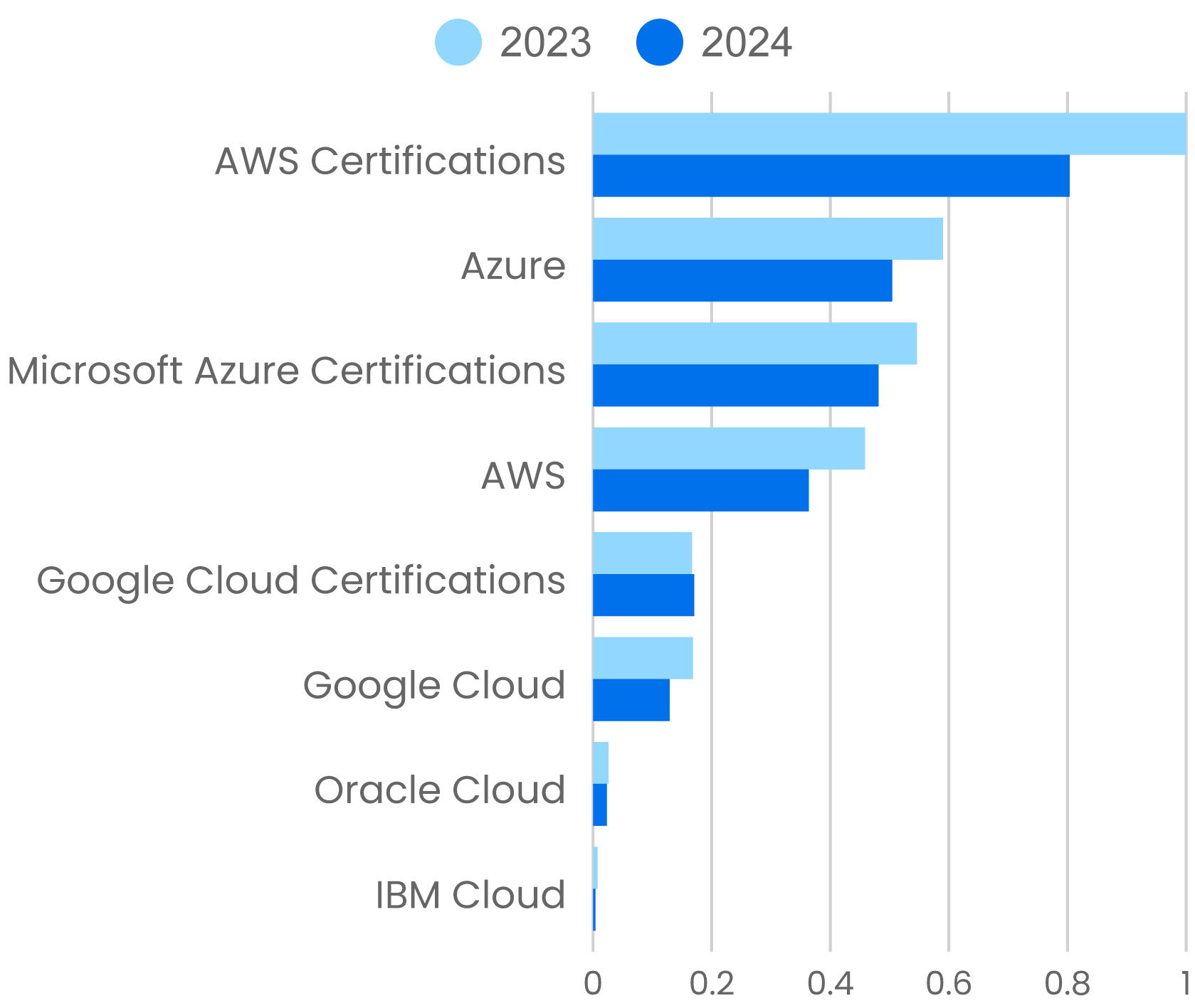 As we mentioned above, we also saw a drop in the relatively new certification for HashiCorp’s Terraform (43%). That’s a sharp decline—particularly since use of content about Terraform itself only declined 4.0%, showing that Terraform skills remain highly desirable regardless of the certification. A sudden drop in certification prep can be caused by a new exam, making older content out-of-date, but that isn’t the case here. Terraform certification certainly wasn’t helped by HashiCorp’s switch to a Business Source License or the subsequent fork of the Terraform project. IBM’s pending acquisition of Terraform (set to close before the end of 2024) may have introduced more uncertainty. Is the decline in interest for Terraform certification an indicator of dissatisfaction in the Terraform community?