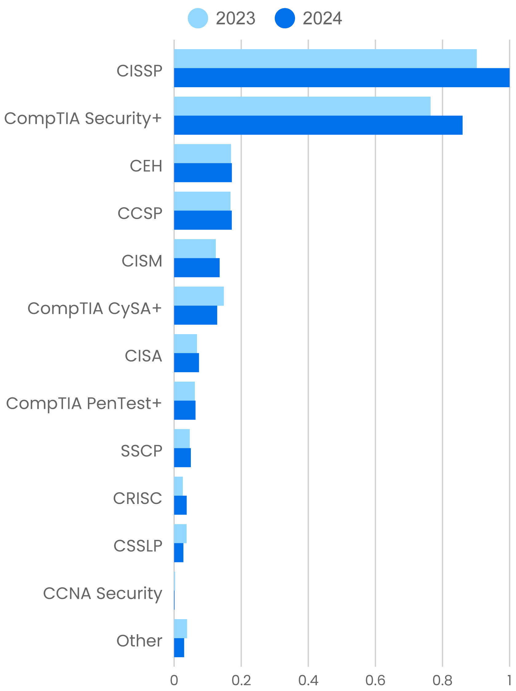 We’re missing one important piece of the security certification puzzle. There’s no data on AI security certifications—and that’s because there aren’t any. Software that incorporates AI must be built and operated securely. That will require security experts with AI expertise (and who can demonstrate that expertise via certifications). We expect (or maybe a better phrase is “we hope”) that lack will be addressed in the coming year.