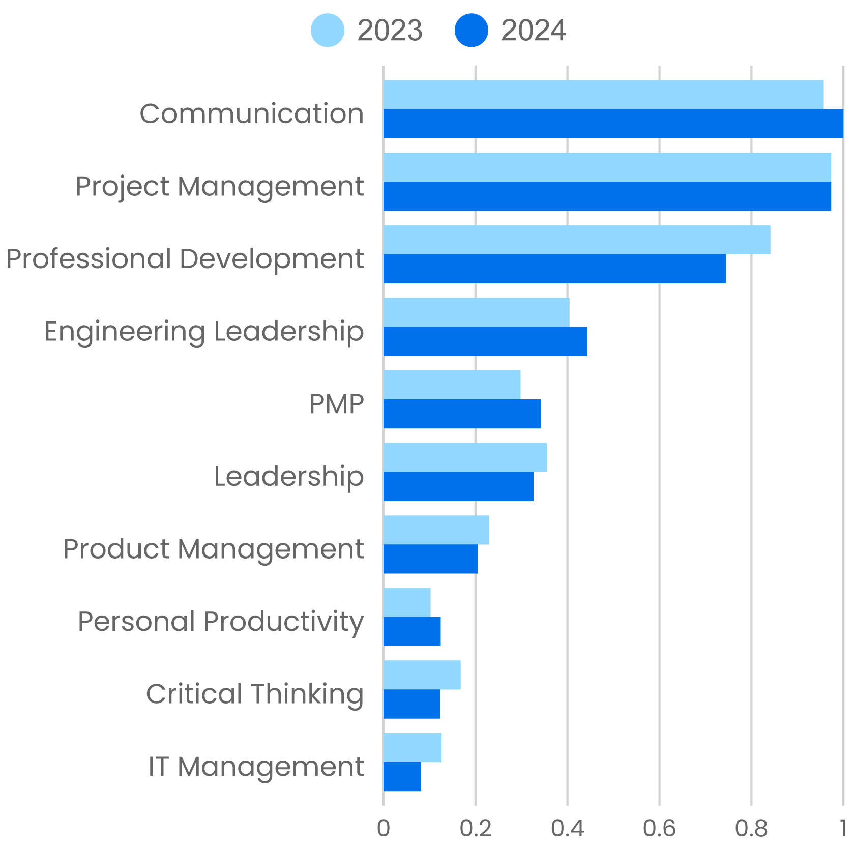 Project Management was almost unchanged from 2023 to 2024 (up 0.01%), while the use of content about the Project Management Professional (PMP) certification grew 15%. Interest in Product Management declined 11%; it seems to be a skill that our users are less interested in. Why? For the past few years, product manager has seemed to be a trendy new job title. But in last year’s report, Product Management only showed a small gain from 2022 to 2023. Is interest in Product Management as a skill or as a job title fading?
